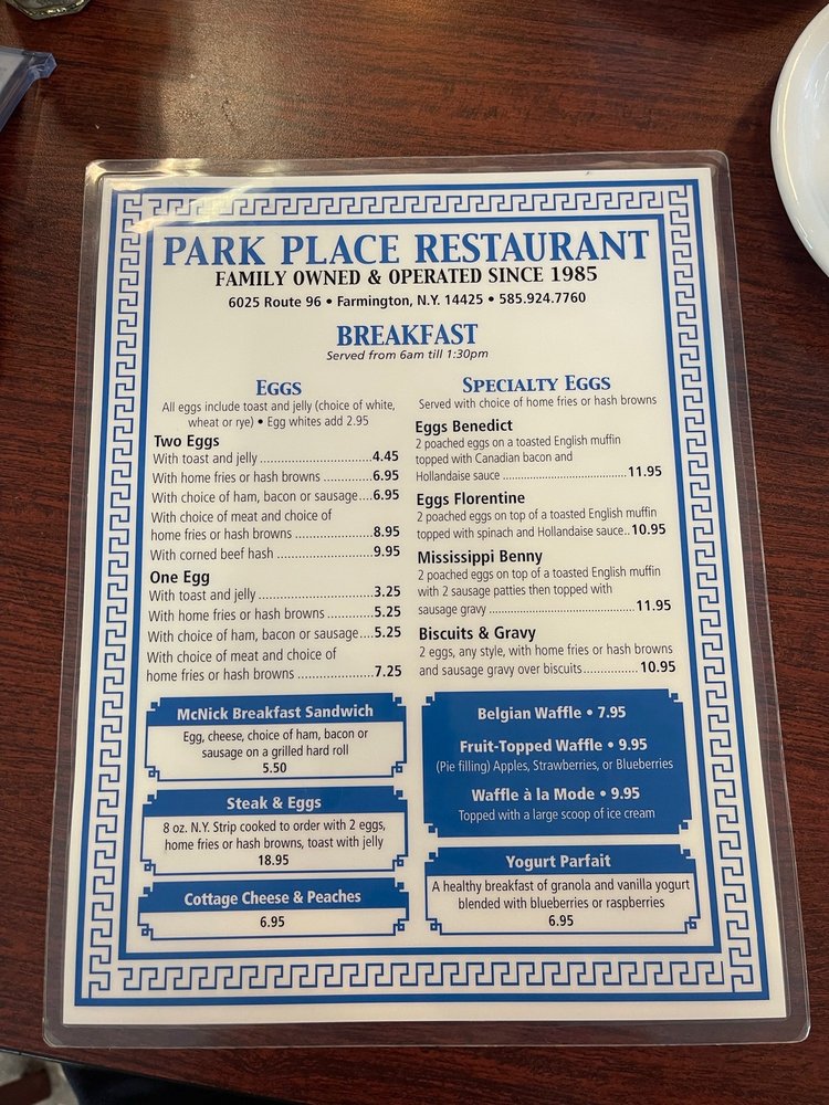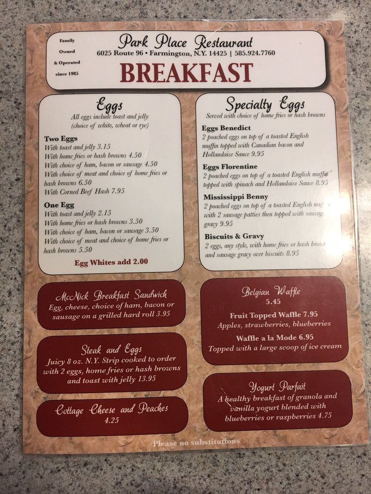 Introducing Park Place Restaurant, a versatile American eatery in Farmington, NY. This establishment offers a range of dining options, from takeout and delivery to dine-in experiences. With a diverse menu featuring many vegetarian options, Park Place caters to a variety of dietary preferences. The casual and vibrant atmosphere makes it ideal for groups, families, and solo diners alike. Alongside convenient amenities such as wheelchair accessibility and ample parking, the restaurant provides attentive waiter service and even outdoor seating for those who prefer al fresco dining. From breakfast to dinner, Park Place Restaurant is a welcoming spot for any meal of the day. Don't miss out on their happy hour specials and extensive drink selection. Overall, Park Place promises a satisfying dining experience with a touch of warmth and hospitality.